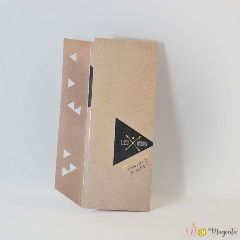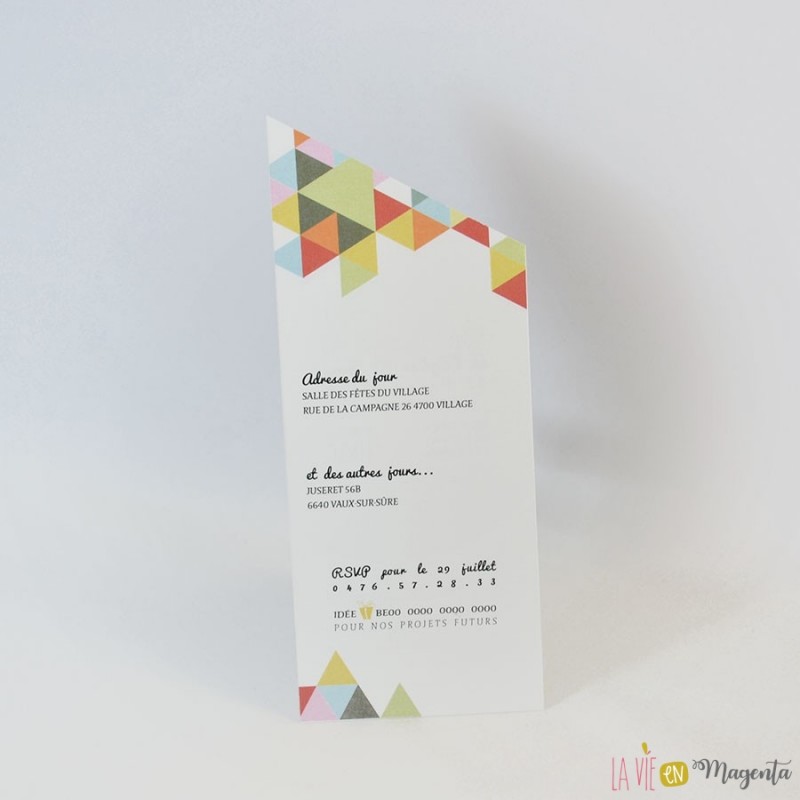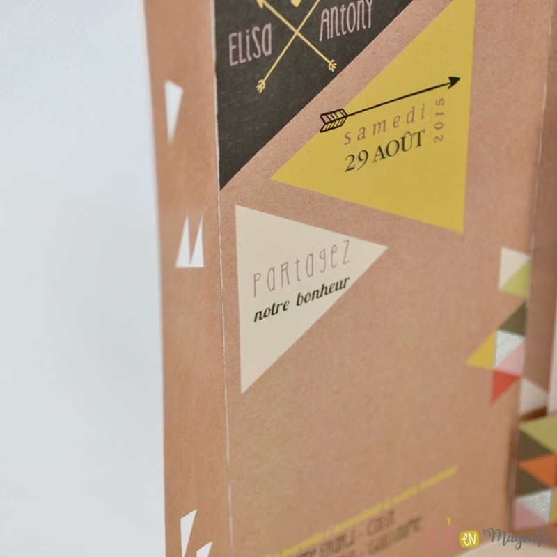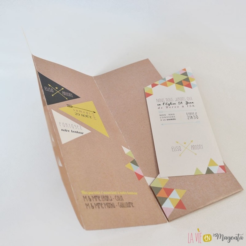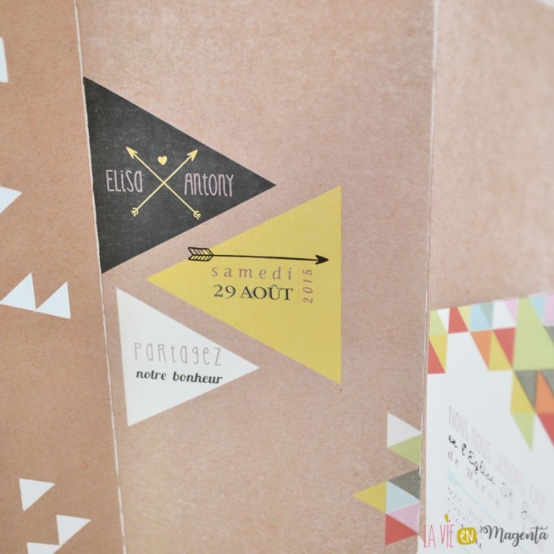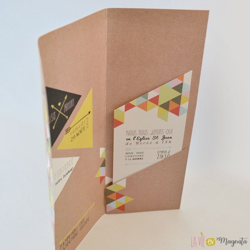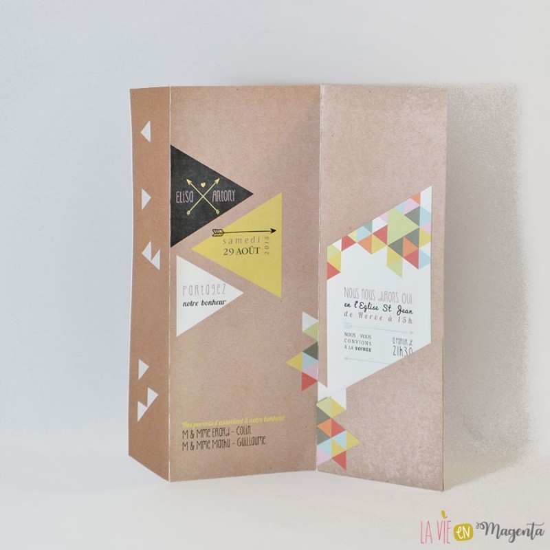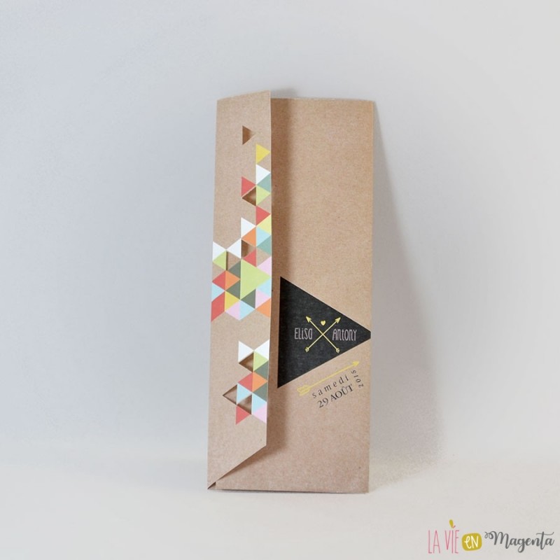 Voici le faire-part "Géométrique", avec un effet kraft et des touches colorées triangulaires.