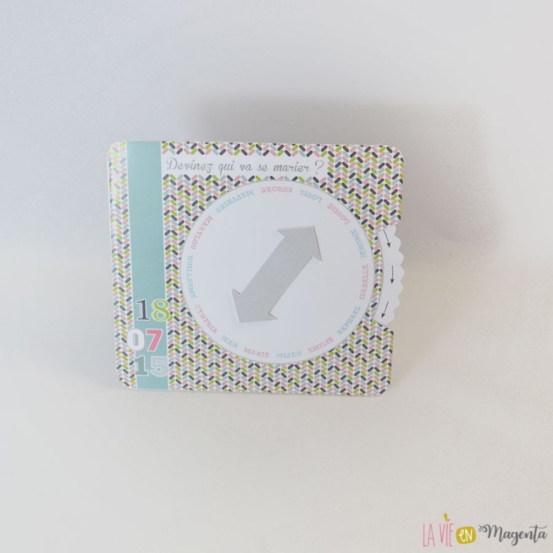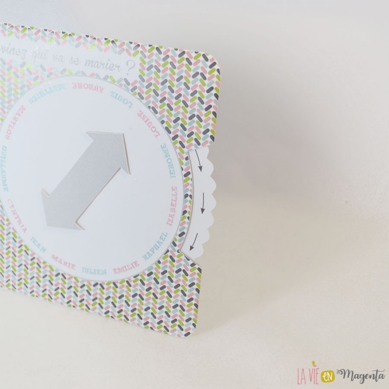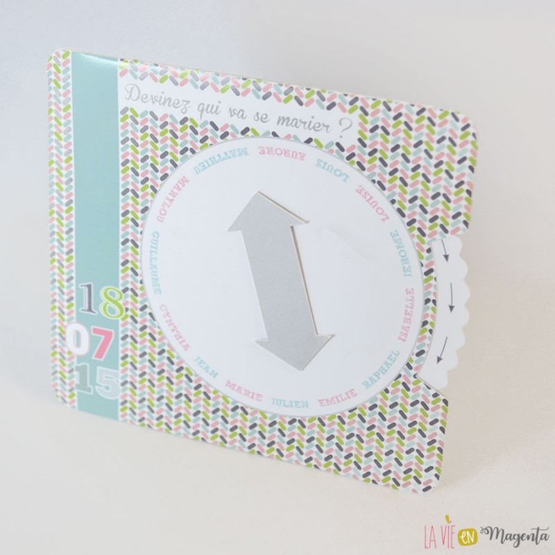 Tournez la roulette (sur le côté droit du faire-part) pour faire bouger la flèche et découvrir l'association des couples.