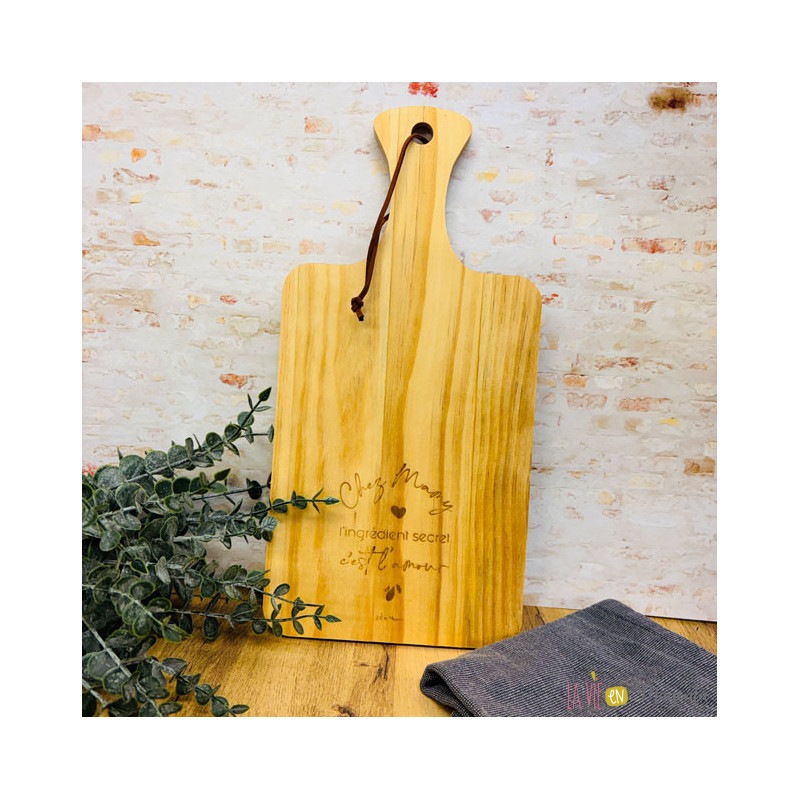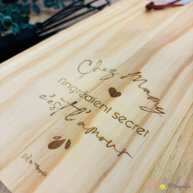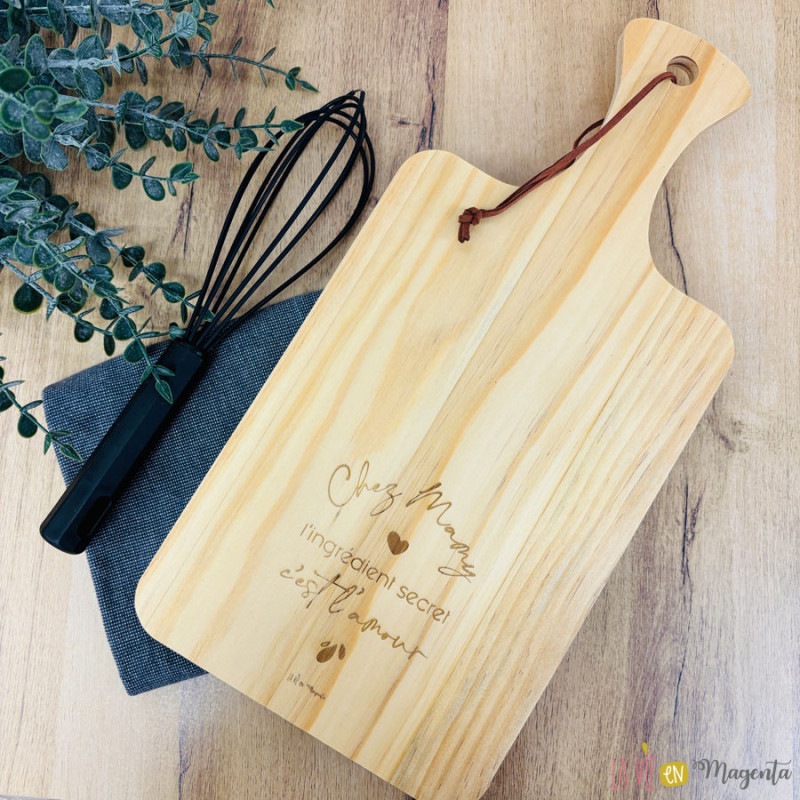 Planche apéro en bois gravée au laser, avec ficelle. Un cadeau pratique et décoratif, idéal pour les mamys amatrices de cuisine.