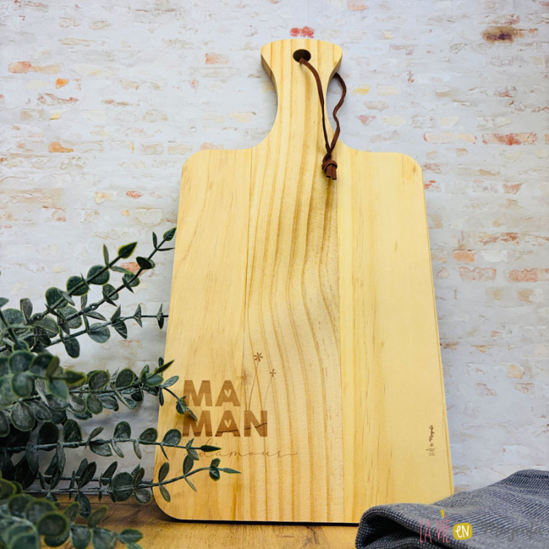 Planche apéro en bois gravée au laser, avec ficelle. Un cadeau pratique et décoratif, idéal pour les mamans amatrices de cuisine.