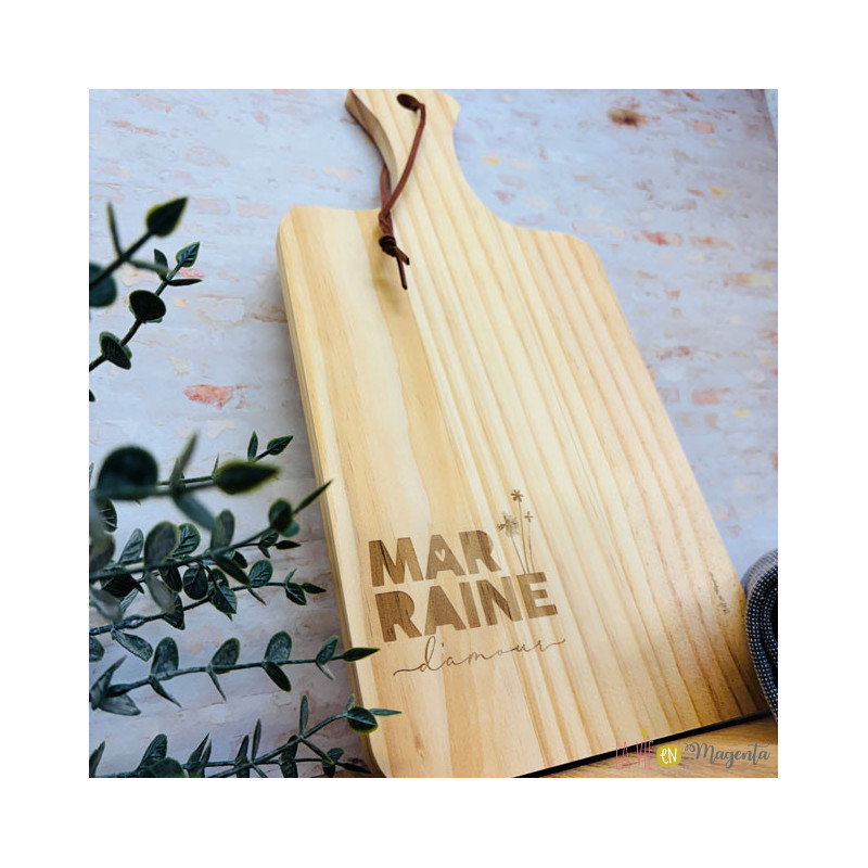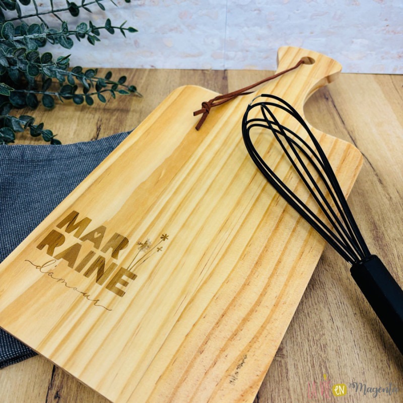 Planche apéro en bois gravée au laser, avec ficelle. Un cadeau pratique et décoratif, idéal pour une marraine amatrice de cuisine.