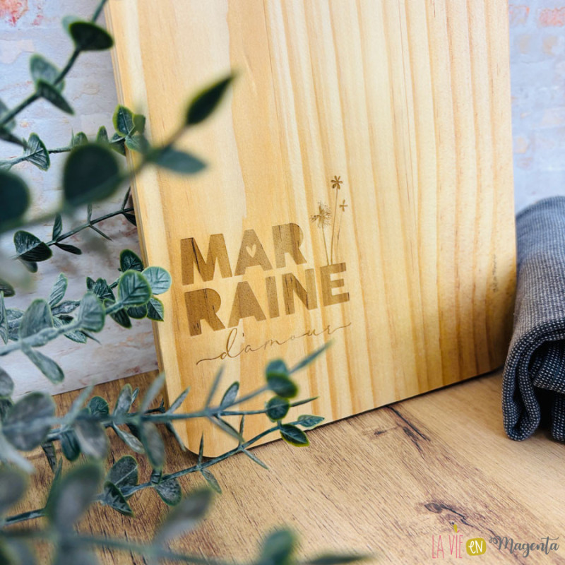 Une planche apéro en bois gravée avec un message tendre pour une marraine.