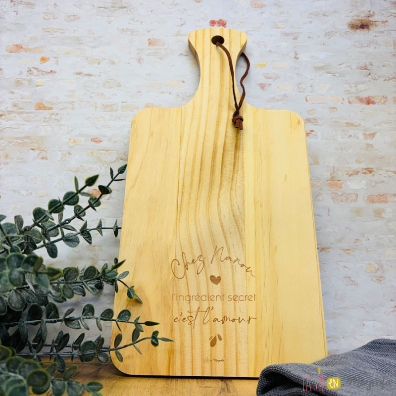 Planche apéro en bois gravée au laser, avec ficelle. Un cadeau pratique et décoratif, idéal pour les Nanous amatrices de cuisine.