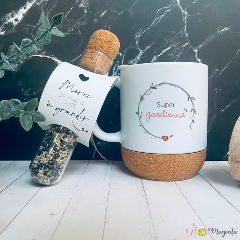 Kit cadeau thé avec mug personnalisé porcelaine & infuseur verre liège – Idée originale pour remercier une gardienne