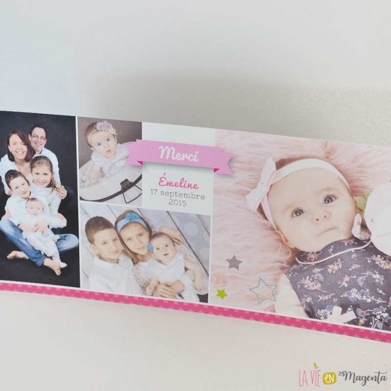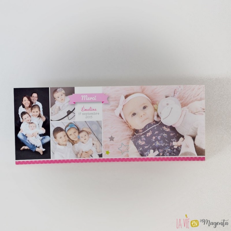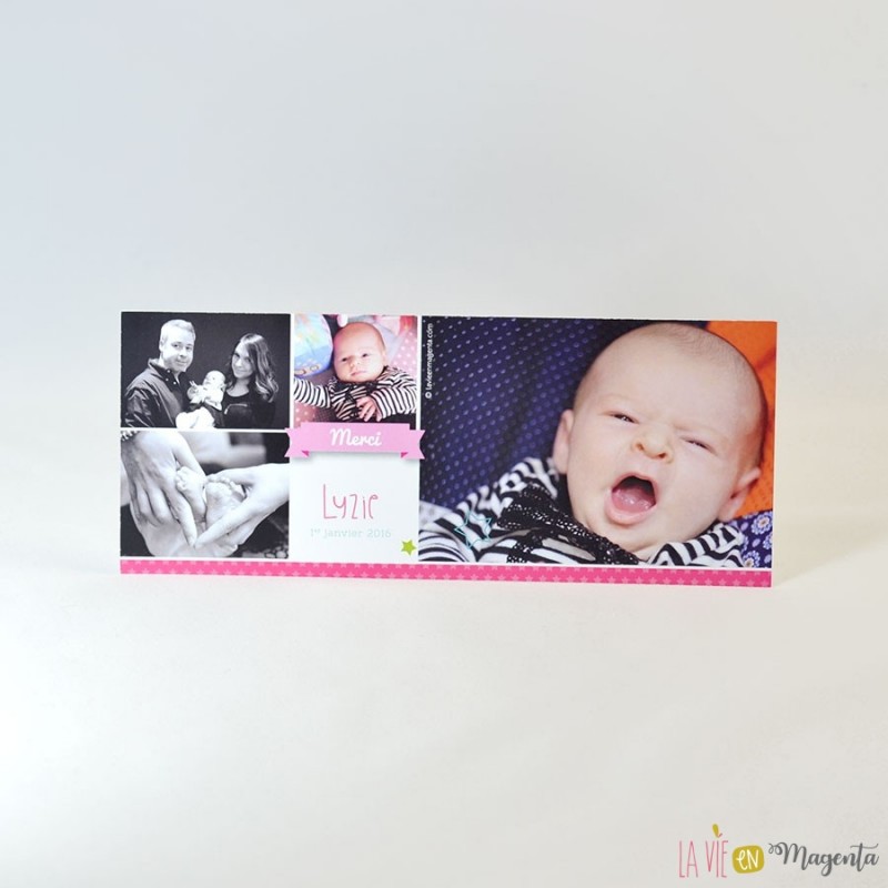 Possibilité de modifier les couleurs du remerciement aux couleurs du faire-part assorti (et ce, gratuitement).