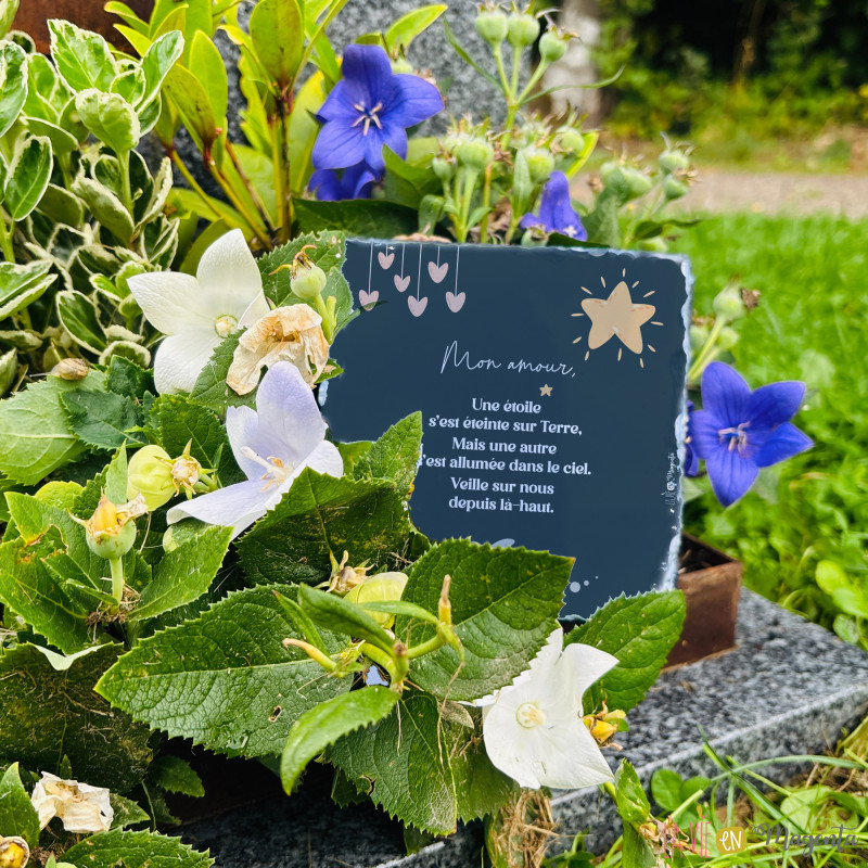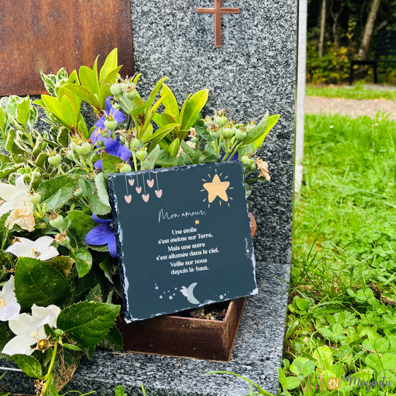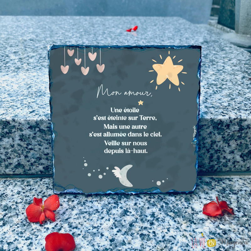 Ardoise photo décorative en ardoise naturelle, authentique et unique, pour honorer la mémoire d’un être cher. Chaque pièce est réalisée avec ses bords irréguliers et sa texture brute, symbole d’émotion et de souvenir durable.